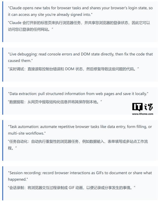 该文件核心功能是让特定的浏览器扩展调用本地可执行程序。Anthropic 官方文档显示,此组件具备强大的浏览器自动化能力,包括打开新标签页、共享登录状态、读取 DOM 内容、填充表单以及录制屏幕。这意味着,一旦用户安装了对应的扩展,该程序将能以用户身份访问银行、税务等敏感网站,且运行在浏览器沙箱之外,拥有用户级权限。
