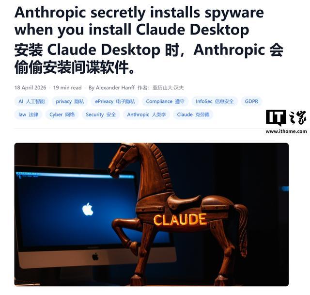 IT之家 4 月 23 日消息,网络安全专家亚历山大 · 汉夫(Alexander Hanff)于 4 月 18 日发布博文,指出 Anthropic 的 Claude Desktop 应用在用户不知情的情况下,向 7 款 Chromium 浏览器静默安装了 Native Messaging 桥接文件。